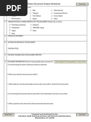 Document Analysis Worksheets. Document analysis is the first step in working with primary sources. Teach your students to think through primary source documents for contextual understanding and to extract information to make informed judgments. Use these worksheets — for photos, written documents, artifacts, posters, maps, cartoons, videos ...