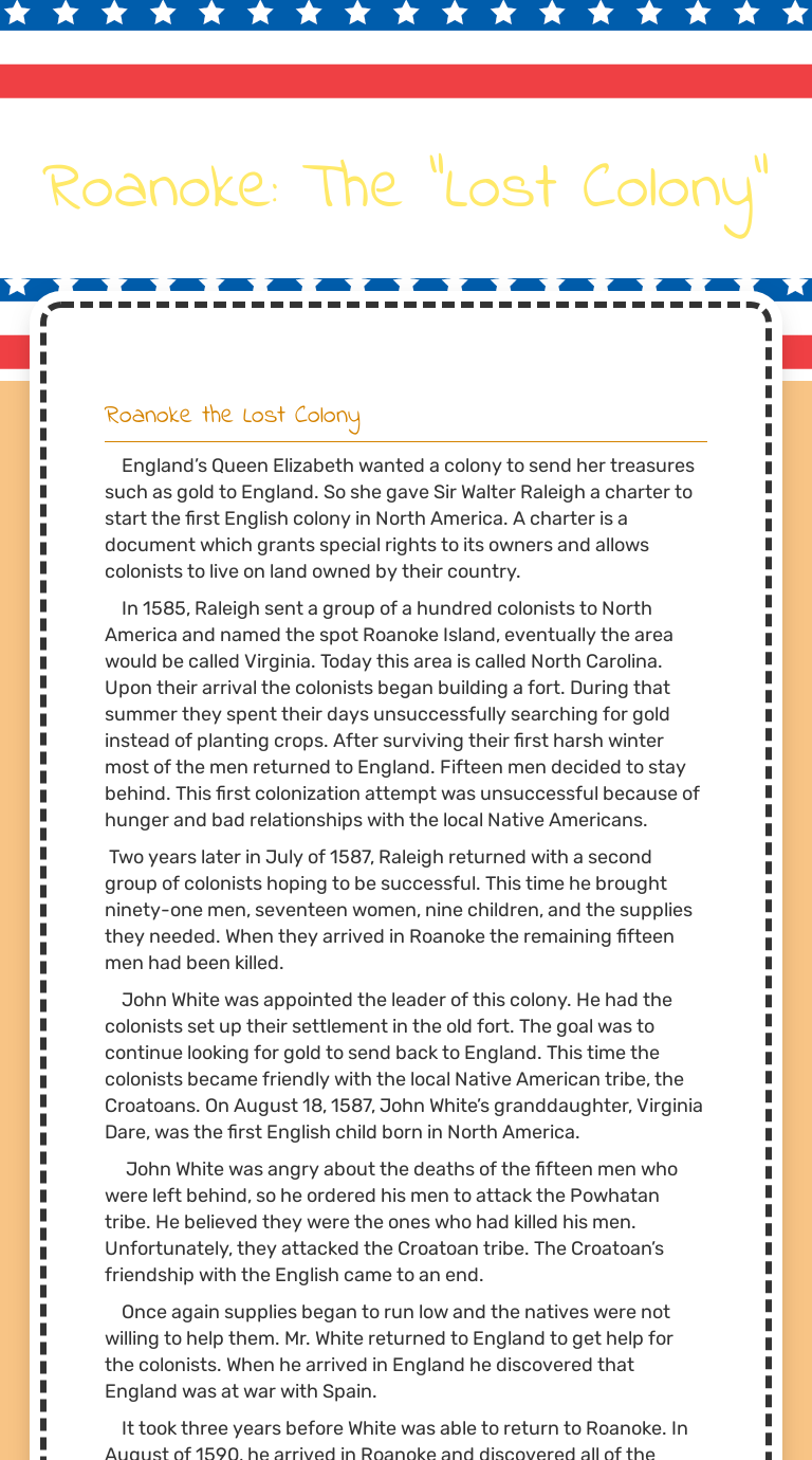 Lost Colony at Roanoke Reading Comprehension. This resource includes a historical passage and seven multiple choice questions. PASSAGE LENGTH: 426 Words; LEXILE: 910. This activity can be copied directly into your Google Classroom, where you can use it for practice, as an assessment, or, to collect data. Upgrade to MrN 365 to access our entire ...