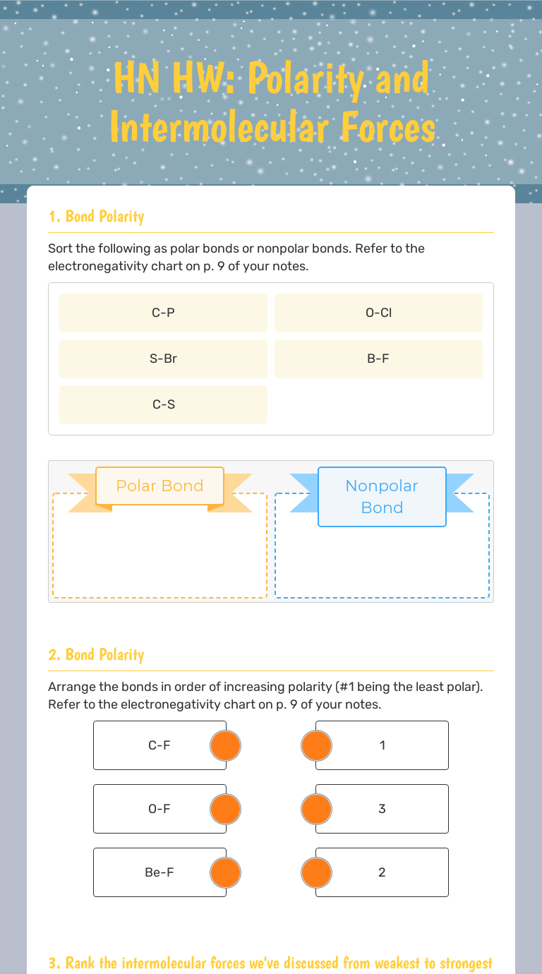 Polarity and intermolecular forces worksheet answers. 1 carbon disulfide or sulfur difluoride. Intermolecular forces worksheet answer key are three of main things we will show you based on the gallery title ap chemistry practice questions solids liquids and. Describe how the polar nature of water molecules causes this.