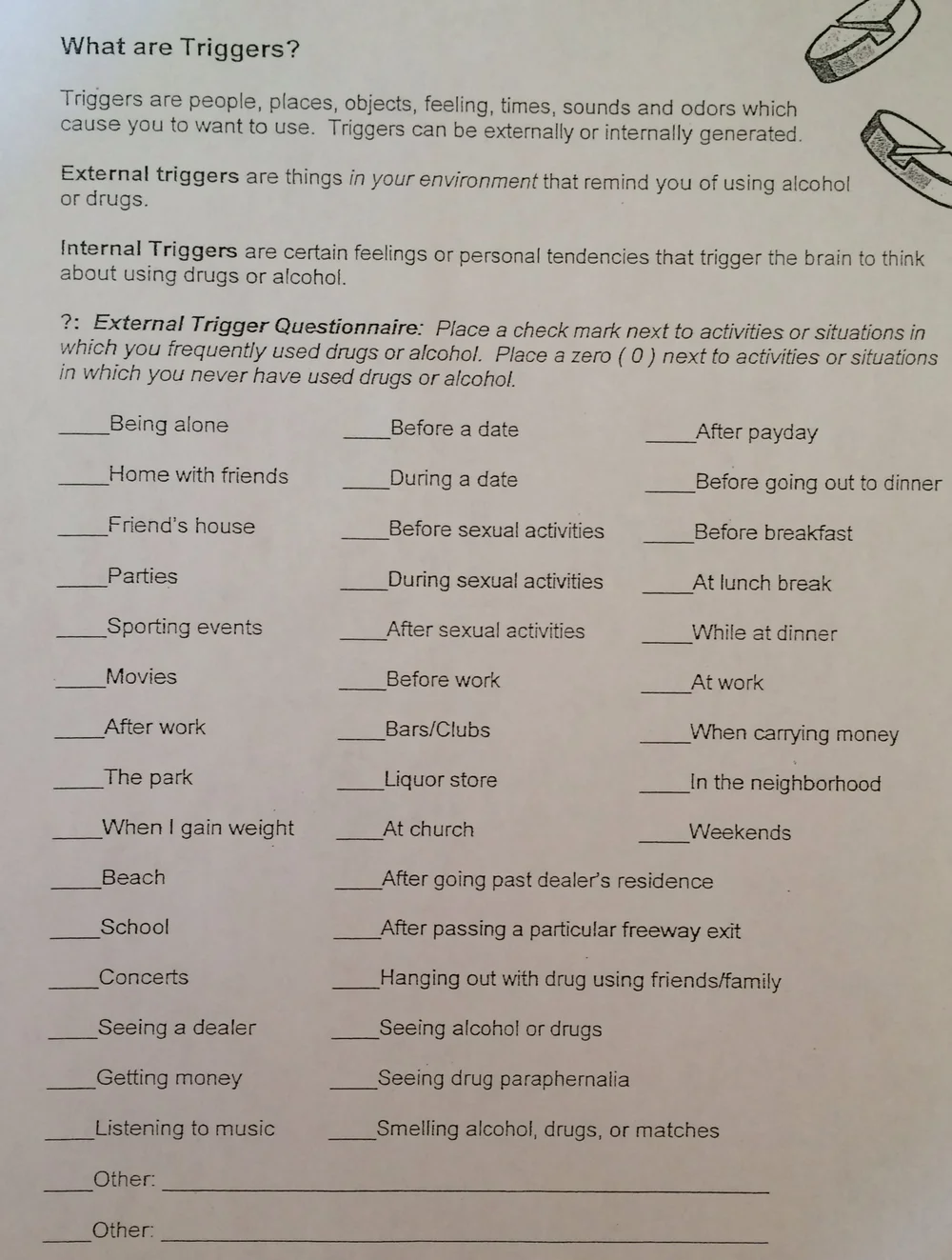 Addiction Triggers - Displaying top 8 worksheets found for this concept.. Some of the worksheets for this concept are Triggers, Exercise on identifying triggers, , Asi mv work handouts, A relapse prevention tool, Client workbook, Understanding and reducing angry feelings, Early recovery skills group handouts.