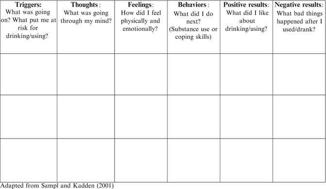 Substance Use Triggers Worksheet. Managing Thoughts of Using Worksheet. Emotions Worksheet. Social Pressures Worksheet. Relationships Worksheet. Interpersonal Style Worksheet. Family Effects Worksheet. Recovery Network Worksheet. Self-Help Program Worksheet. Relapse Warning Signs Worksheet. High-Risk Situations Worksheet. Lapse and Relapse ...
