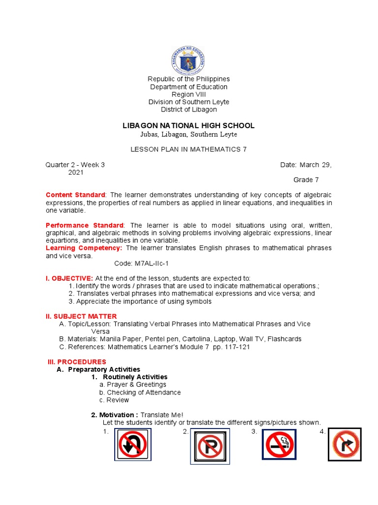 Lesson Plan in Translating Verbal To Mathematical Sentence ...