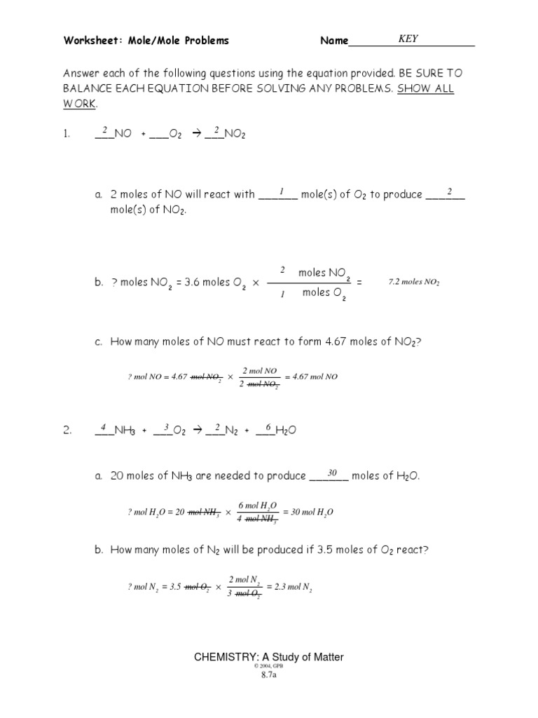Holt ChemFile: Problem-Solving Workbook 48 Mole Concept Mole Concept Suppose you want to carry out a reaction that requires combining one atom of iron with one atom of sulfur. How much iron should you use? How much sulfur? When you look around the lab, there is no device that can count numbers of atoms. Mole map tool 2 worksheets 20 problems answer keys from solubility curve worksheet answer key source. CrOH 3 3 HClO 4 CrClO 4 3 3 H 2 O Write the balanced chemical equations of each reaction. Elements of physics motion force and gravity forces worksheet 1 answer key. A solution contains 01 mole of HC2H3O2 dissolved in 05 L of solution. Worksheet: Mole/Mole Problems Name Answer each of the following questions using the equation provided. BE SURE TO BALANCE EACH EQUATION BEFORE SOLVING ANY PROBLEMS. SHOW ALL WORK. 02 mole(s) of 02 to produce a. 2 moles of NO will react with mole(s) of N02. moles NO b. ? moles NO : 3.6-¥F'Ûfes-O— x c.