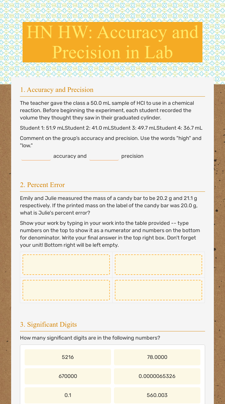 Accuracy and precision percent error worksheet answers. Oct 31, 2021 · As a member, you'll also get unlimited access to over 84,000 lessons in math, English, science, history, and more. Plus, get practice tests, quizzes, and personalized coaching to help you succeed. Carefully measure those quantities, to verify the accuracy of your analysis. If there are any substantial errors (greater than a few percent), carefully check your circuit’s construction against the diagram, then carefully re-calculate the values and re-measure. worksheet values before being formatted. Figure 4-5 The Expense Report worksheet values after being formatted. Select a number category Select a number format Preview of the selected number format Figure 4-3 Figure 4-4 Figure 4-5 In this lesson, you will learn how to apply number formats. Applying number formatting changes Accuracy and Precision. Accuracy is how close a measurement is to the correct value for that measurement. The precision of a measurement system is refers to how close the agreement is between repeated measurements (which are repeated under the same conditions).
