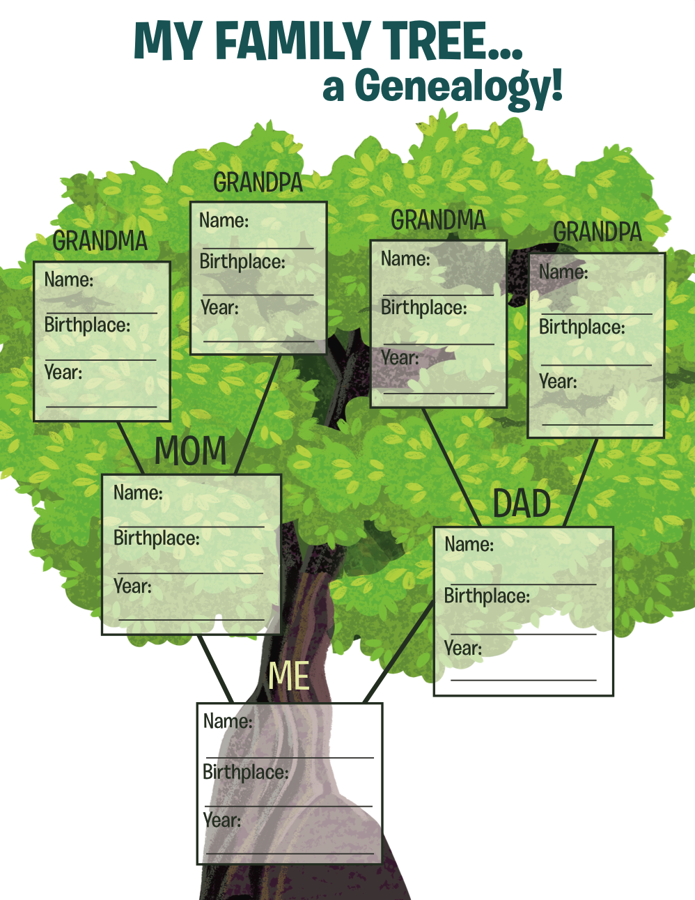 Click on each image to download as a PDF. All images and PDFs ©2014-2019 Emily Kowalski Schroeder, GrowingLittleLeaves.com. Printables for personal use only. Please contact Ms. Schroeder if needed for classroom educational use or programming. May not be reproduced or redistributed without written consent of owner. Four-generation family tree.