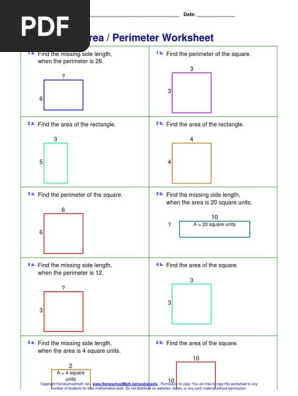 Area / Perimeter Worksheet 1 a. Find the missing side length, when the area is 16 square units.? 2 A = 16 square units 1 b. Find the missing side length, when the area is 24 square units.? 6 A = 24 square units 2 a. Find the perimeter of the rectangle. 4 11 2 b. Find the perimeter of the rectangle. 2 11 3 a. Find the area of the rectangle. 3 3 3 b. Results 1 - 24 of 1290 — This deck will help reinforce how to find the the missing side when the perimeter and one measurement is given. Results 1 - 24 of 44 — Students will use the given total perimeter and width or length to determine the missing side. Use these task cards in a math center, ... Divide the perimeter (3-digit number) by the number of sides to obtain the unknown side length of regular polygons and complete the table. Add up the side measures of each irregular polygon and subtract it from the perimeter to solve for the missing side length. Side length of a Polygon using Perimeter | Decimals