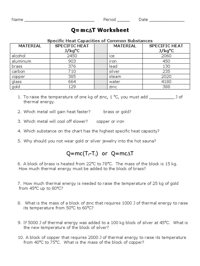 Specific heat worksheet answer key