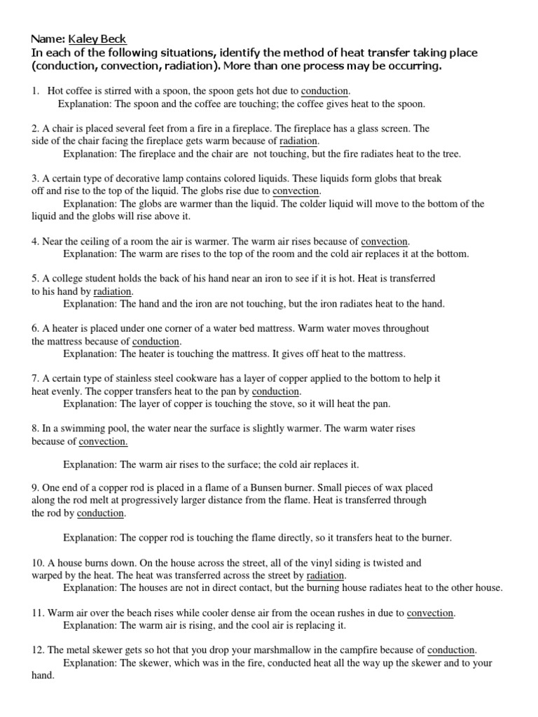 Methods of heat transfer worksheet answers. Transfer of heat by movement of large volumes of fluids moving to balance average KE temperature hot rise cool falls. Transfer of heat by direct contact between materials Define convection. Methods of heat transfer displaying top 8 worksheets found for this concept.