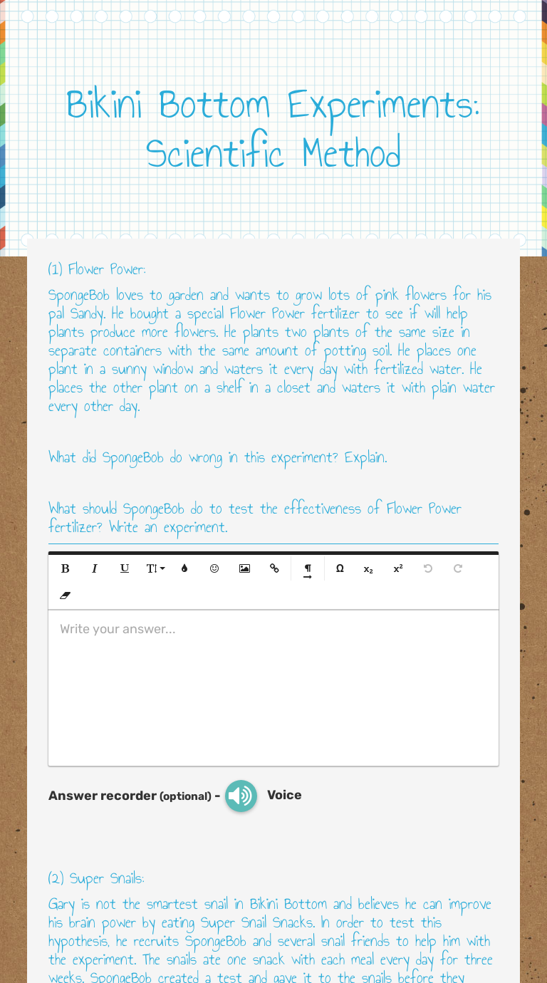 product, he buys the special muscle cream and recruits Patrick and SpongeBob to help him with an experiment. Larry develops a special marshmallow weight-lifting program for Patrick and SpongeBob. He meets with them once every day for a period of 2 weeks and keeps track of their results. Before Read the description for the experiment and use your knowledge of the scientific method to answer the questions. Super Snails. Gary is not the smartest snail in Bikini Bottom and believes he can improve his brain power by eating Super Snail Snacks. In order to test this hypothesis, he recruits SpongeBob and several snail friends to help him ...