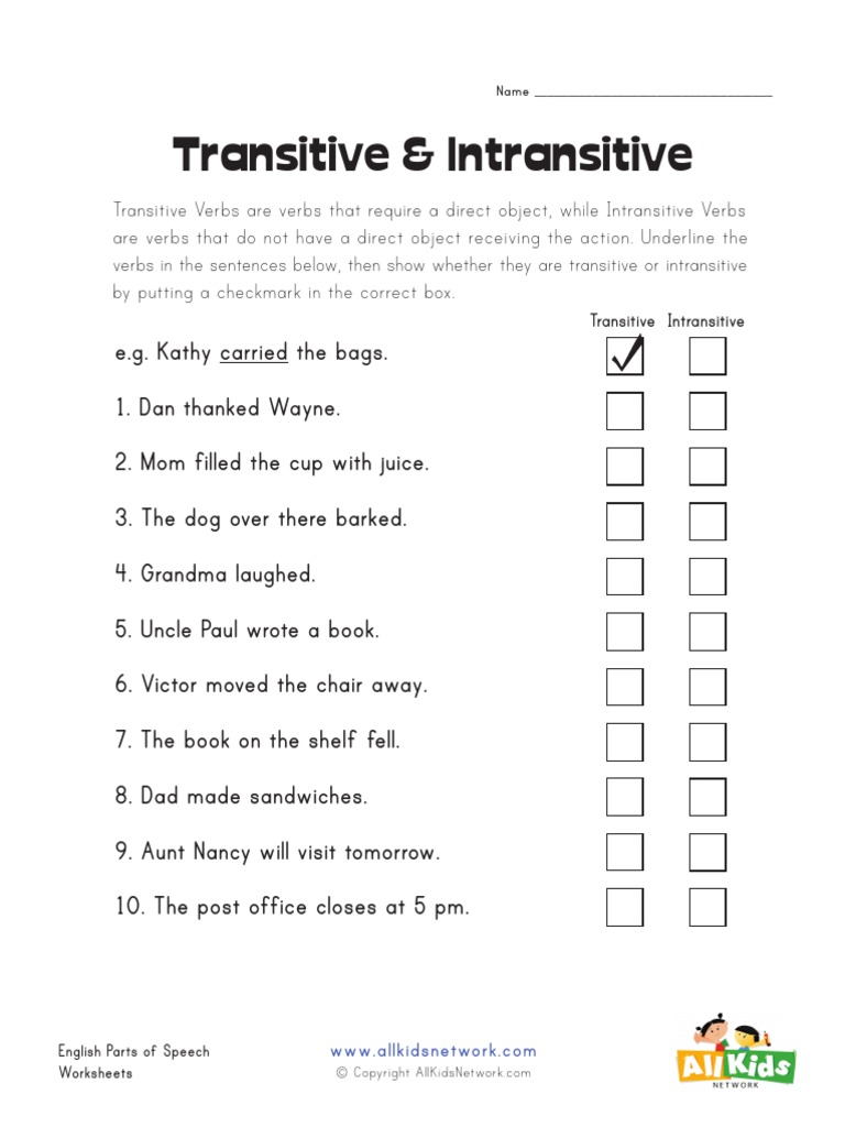 Rethinking the relationship between transitive and intransitive verbs. I rant, "the categories of transitive and intransitive verbs presuppose action. Since linking verbs do not convey action, they should be placed in some other category, not just lumped with intransitive verbs." 3+ Transitive and Intransitive Verb Worksheets. It's not unusual for students to have trouble learning how to construct sentences with the various tenses and verbs. Children are especially receptive to receiving lessons on different parts of speech that they can use in their lessons.