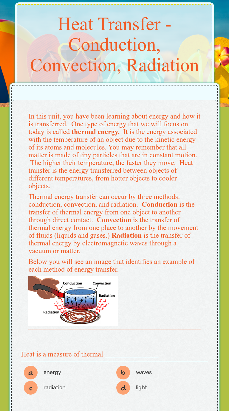 7th Grade Conduction Convection Radiation Worksheet Answer Key Conduction convection radiation worksheet answer key with conduction convection radiation worksheet worksheets for all. Start studying 7th grade ch 04 heat transfer radiation conduction convection. 8 all cooking methods apart from radiation need both. The transfer of heat energy is a major topic in the physics section of gcse science. Conduction, Convection And Radiation Worksheet | TpT This worksheet has 15 Earth Science Regents short answer questions about conduction, convection, and radiation. Students will have to identify and explain the processes of conduction, convection, and radiation from diagrams. This makes a great homework sheet or in-class review. An editable Word do. Conduction Convection Radiation Worksheet Pdf With Answers Conduction convection radiation worksheet answer key. Choose the worksheets you wish to move or replicate. More than one process may be occurring. 3302009 93300 PM Other titles. Doc 1 2 mb this worksheet is designed to make conduction convection and radiation apply to the real life situation of cooking. Radiation radiation convection 10. PDF Conduction Convection and Radiation Worksheet WORKSHEET FREEBIE Conduction, Convection & Radiation by: The Trendy Science ... conduction convection Convection/radiation conduction radiation radiation. 4. Fonts & Clipart. Title: PowerPoint Presentation Author: Dana Niblett Created Date: 1/17/2017 5:40:24 PM ...
