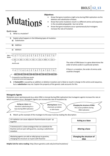Mutations worksheet high school