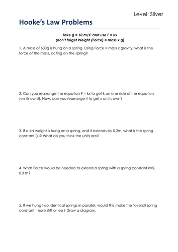 HOOKE'S LAW WORKSHEET WITH ANSWERS | Teaching Resources This worksheet states the relationship between young's modulus, elasticity, stress and strain. simple calculations have also been included to challenge students. Hooke's Law | Boundless Physics Hooke's law of elasticity is an approximation that states that the extension of a spring is directly proportional to the load applied to it. Mathematically, Hooke's Law can be written as F=-kx. Many materials obey this law as long as the load does not exceed the material's elastic limit. panswinia.pl 2 days ago · Review package number 1 (KINEMATICS) ANSWERS HERE Unit 1 Test: Nov 7th/8th Projectiles sheet and Answers HERE worked answers here 1D Kinematics Review - Physics Kinematics. Energy Semester Review. Speed. Kinematic Equations Numerical Calculations Practice Khan Academy Kinematics WorksheetA. File Size: 430 kb. Worksheet 1 - Acceleration and ... Hooke's law test questions - CCEA - GCSE Physics (Single Science)... Hooke's law. The extension of an elastic object, such as a spring, is described by Hooke's law.