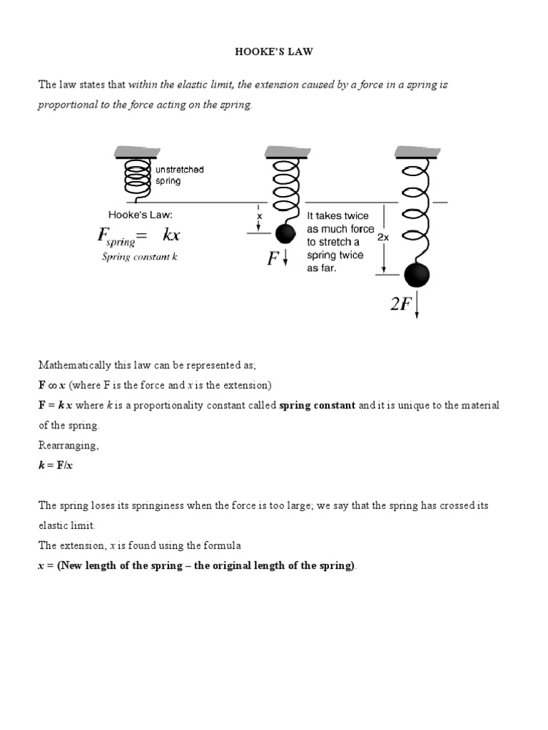 Hooke's Law Practical (examples, solutions, videos, notes) The following diagram gives the formula for Hooke's Law: force, spring constant, extension. Required Practical: Stretching a Spring Describe how to investigate the relationship between force and extension for a spring.