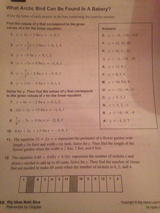 PDF Algebra 1 : Period 3 Worksheet 4.3 Puzzle Time, Worksheet 4.4 Puzzle Time, Worksheet 4.6 Puzzle Time Week Two: Review Chapter 5: Solving Systems of Linear Equations omplete : Worksheet 5.1 Puzzle Time, Worksheet 5.2 Puzzle Time, Worksheet 5.3 Puzzle Time, Worksheet 5.4 Puzzle Time, Worksheet 5.6 Puzzle Time Worksheets can be printed (if you have access to a printer ... › YR-8-COMPLETE-ANSWERS-pdfYr 8 Complete Answers | PDF | Digestion | Carbohydrates From F. 1.0 1.2 1.4 1.6 1.8 2.0 2.2 2.4 chiloensis they have inherited large fruits, ability to grow in full sunshine. Total plant height (cm) b Students explain that, in sexual L6 c Yes. As the height of the plant increases, reproduction, a parent makes gametes that contain so does the width of the flower. PDF 2.1 Puzzle Time - ohio.k12.ky.us Puzzle Time Name_____ Date_____ What Arctic Bird Can Be Found In A Bakery? Write the letter of each answer in the box containing the exercise number. Find the values of y that correspond to the given values of x for the linear function. 1. yx x=+ =43 for 1,0,1 − 2. 3 5 for 0, 2, 4 2 yx x=−+ = 3.