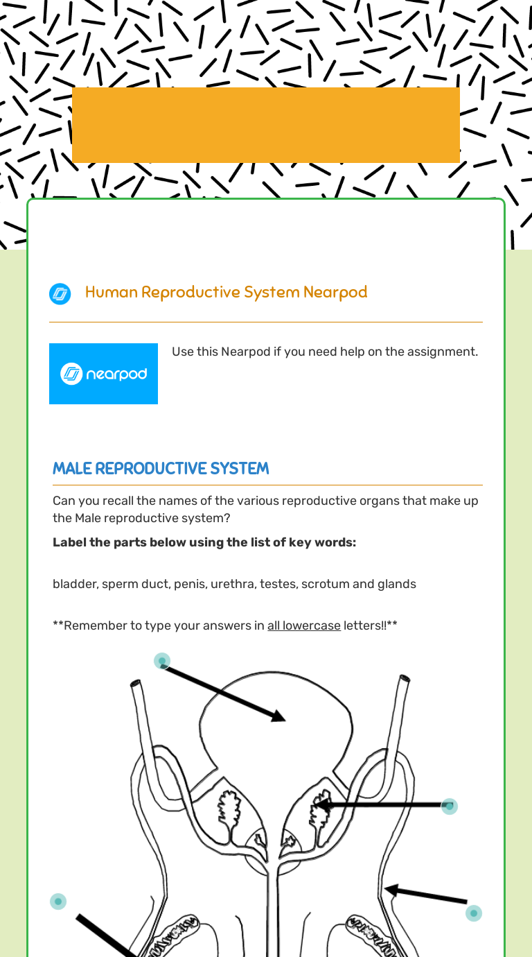 learnykids.com › worksheets › Male-Reproductive-SystemMale Reproductive System Worksheets - Learny Kids Displaying top 8 worksheets found for - Male Reproductive System. Some of the worksheets for this concept are Biology 12, Male reproductive system, Name reproductive system work, Lesson 4 everybodys got body parts part 1, Reproductive system, Human female reproductive system cloze work, Male and female reproductive body parts, Chapter 13 the human reproductive system. › rj1715028lfMale Reproductive worksheet worksheet Male Reproductive worksheet Male Reproductive system ID: 1715028 Language: English School subject: Health science Grade/level: Grade 9 Age: 12-15