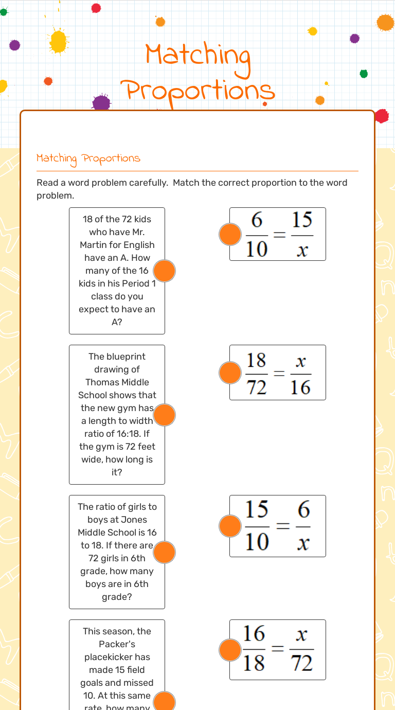 Proportions worksheet 6th grade. Grade 6 Ratio and Proportion Worksheets - WorkSheets Buddy Grade 6 Ratio and Proportion Worksheets November 9, 2020 by worksheetsbuddy_do87uk Grade 6 Maths Ratio and Proportion Multiple Choice Questions (MCQs) 1. If x, 30, 24 and 16 are in proportion then find the value of x. (a) 45 (b) 60 (c) 80 (d) none of these 2. If 8, 18, 18 and x are in proportion then find the value of x. (a) 405 (b) 40.5 (c) 81 Grade 6 Math Worksheet: Solving proportions | K5 Learning Below are six versions of our grade 6 math worksheet on solving proportions. In these questions, the proportions are shown in the form of equivalent fractions. These worksheets are pdf files. What is K5? K5 Learning offers free worksheets, flashcards and inexpensive workbooks for kids in kindergarten to grade 5. PDF Grade 6 Proportions Word Problems - K5 Learning Grade 6 Proportions Worksheet 1) 24 loaves of bread cost $48. How much does 10 loaves cost? 2) A chef made 30 donuts in 60 minutes. How long would it take him to make 90 donuts? 3) Four big water bottles can hold 8 gallons of water. How much water can ten big water bottles hold? 4) It took Nora 10 hours to walk a 30-mile trail. How long did it ... 6th Grade Solving Proportions Worksheet - Worksheet Smart These worksheets are pdf files. Worksheets math grade 6 proportions. 6th grade ratios and rates worksheets pdf with answers are giving to help kids with situation or word problems which include proportional relationship between different values. Proportions word problems using decimals ratio word problems.