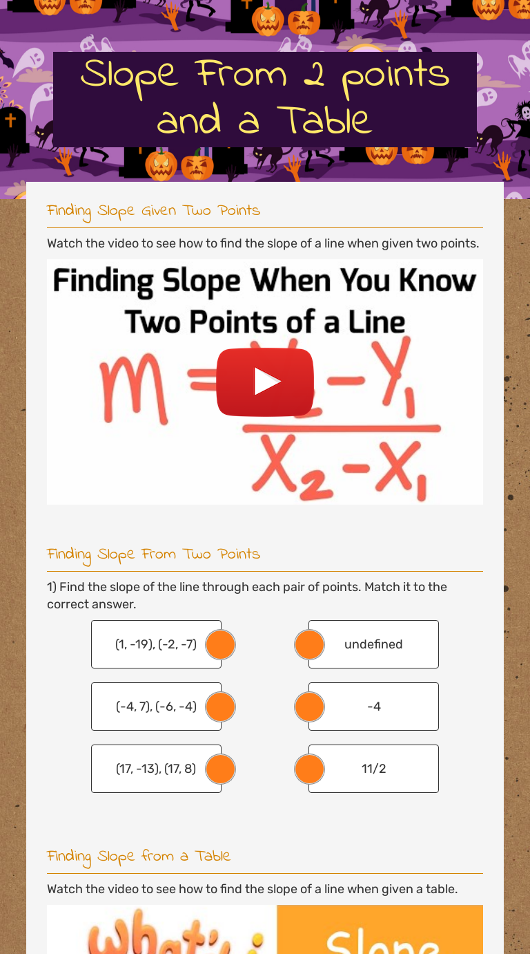 Finding Slope From 2 Points Worksheets & Teaching ... 3. $1.75. PDF. This is a finding slope from two points RIDDLE worksheet.18 problemsIncludes zero and undefinedA version without the riddle is includedThis product is included in the Slope Bundle* If you are already an Algebrafunsheets.com subscriber, you already have access to this and over 400+ worksheets.