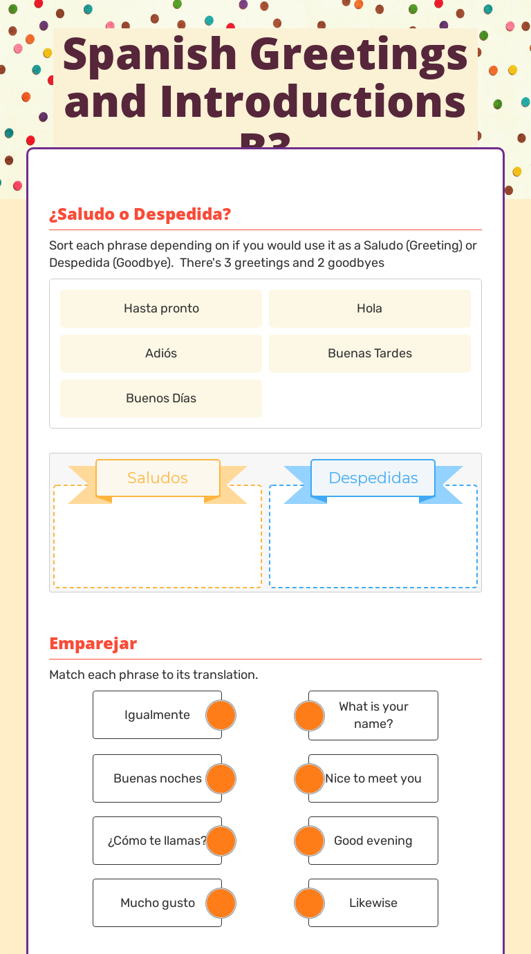 Spanish Greetings Worksheets Get these free Spanish greetings worksheets with their English meanings to help you learn how to greet a person at different times of the day. The most common greetings are hello and goodbye in English and in Spanish those are the two most used greetings (hola and adios). Spanish Introductions And Greetings Worksheet , Jobs EcityWorks Spanish Greetings Worksheet - Match The Spanish With The English spanish4teachers.org (elementary) practice greetings matching the English version with the Spanish one.