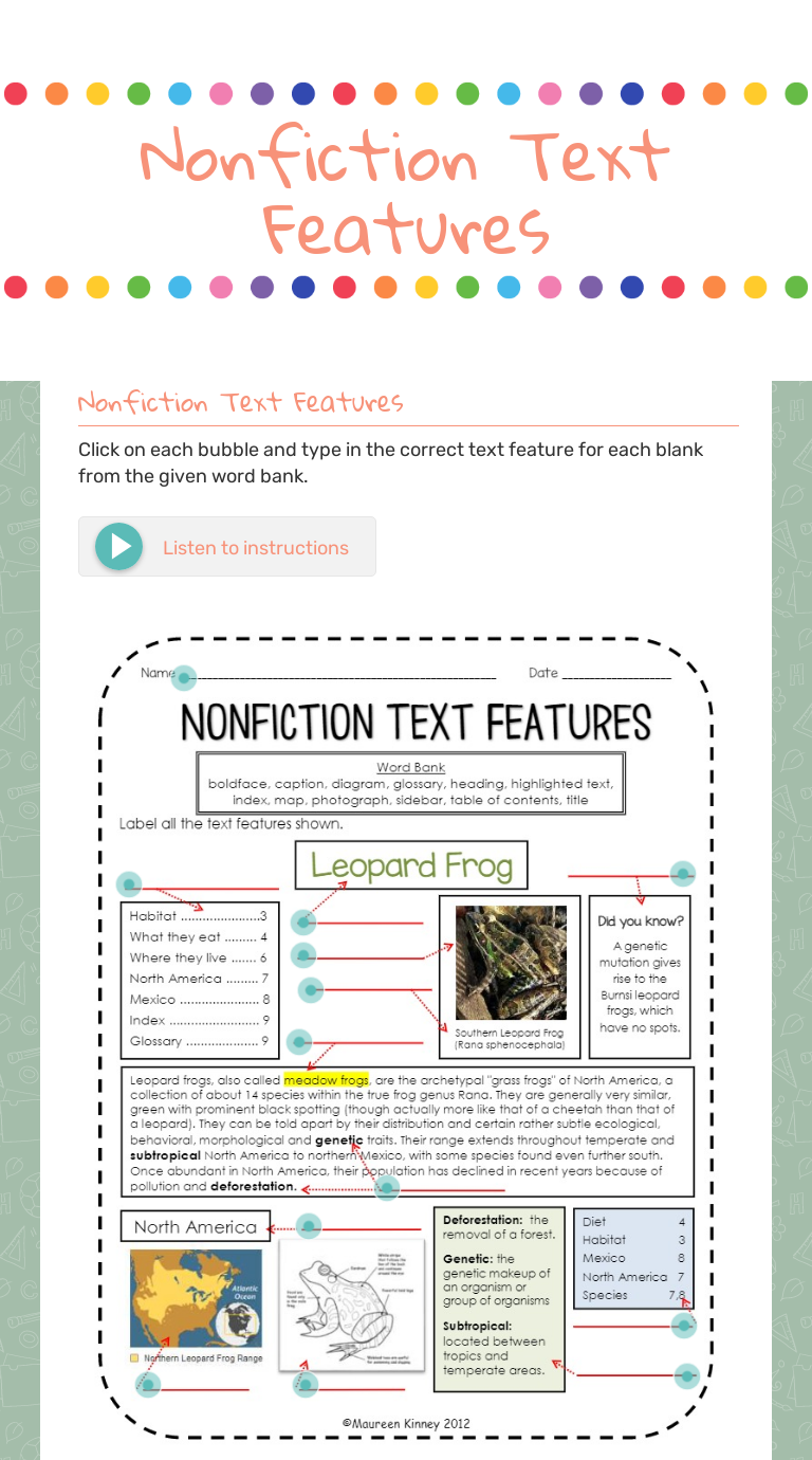 Non-Fiction Text Features worksheet Non-Fiction Text Features. This worksheet allows candidates to type in the space provided, all the text features to which the arrow is pointing. ID: 1589592. Language: English. School subject: English Language Arts (ELA) Grade/level: Grade 4-6. Age: 9-12. Main content: Text Features.