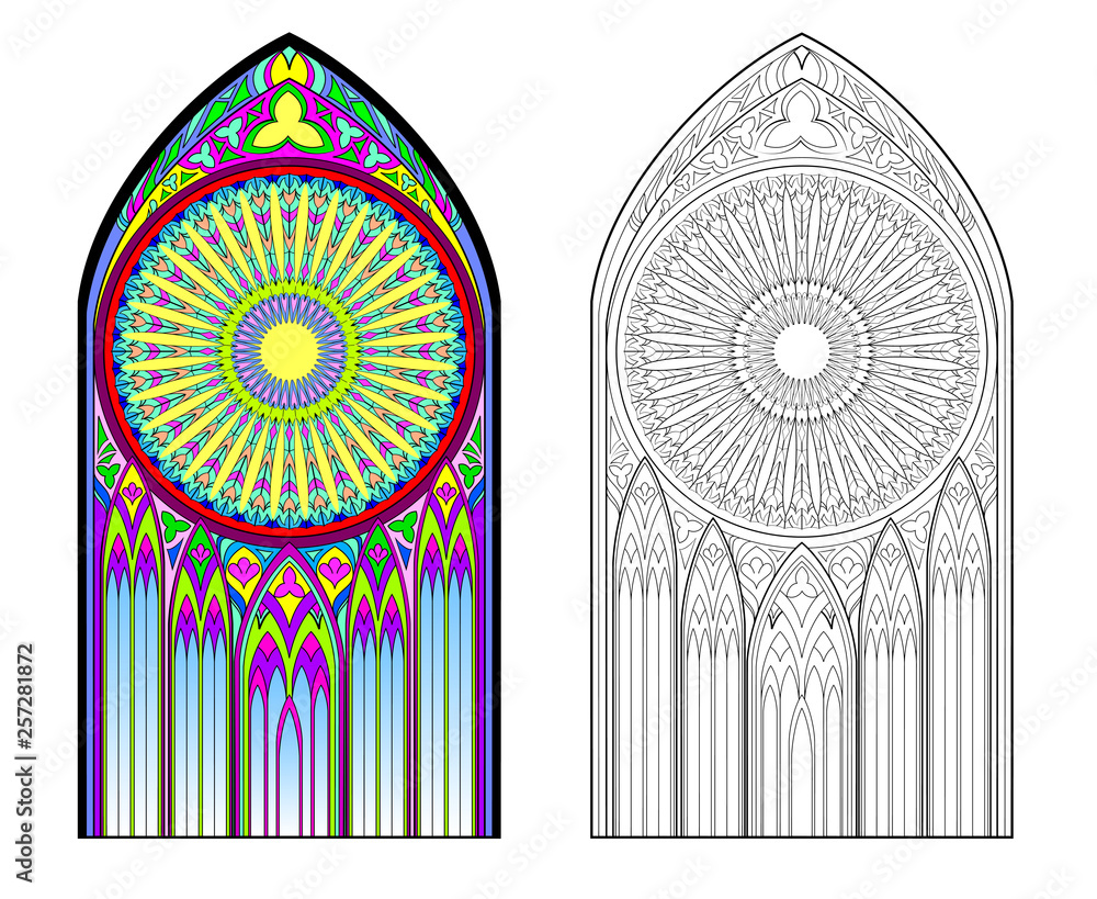 Colorful And Black And White Pattern Of Gothic Stained Glass Window. Drawing of beautiful window with stained glass in Art Nouveau style. Fantasy drawing of beautiful Gothic windows with stained glass in medieval style. Worksheet for children and adults. Vector image.