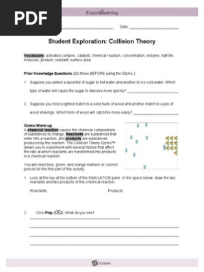 Student Exploration_ Collision Theory.pdf - Student ... View Student Exploration_ Collision Theory.pdf from SCIENCE 304 at Springbrook High. Student Exploration: Collision Theory Vocabulary : activated complex, catalyst, chemical reaction,