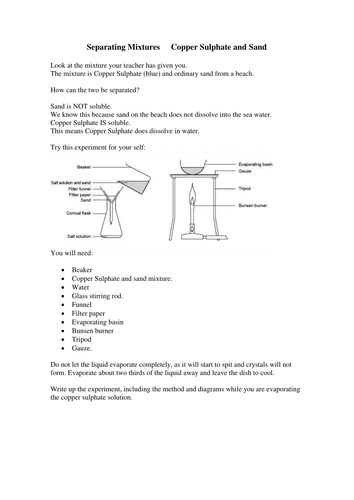 Separation of mixtures worksheet. Classification of Matter - Chemistry LibreTexts Separation of Mixtures. Most substances are naturally found as mixtures, therefore it is up to the chemist to separate them into their natural components. One way to remove a substance is through the physical property of magnetism. For example, separating a mixture of iron and sulfur could be achieved because pieces of iron would be attracted to a magnet placed into the … Chemistry for Kids: Separating Mixtures Separation Processes The way in which different substances in a mixture are separated is called a process. There are a number of different processes used for separation. Many of them are very complex and involve dangerous chemicals or high temperatures. A lot of important industries in the world today are based on separation processes. Filtration One common method of … 1.4 Laboratory Techniques for Separation of Mixtures ... 1.4 Laboratory Techniques for Separation of Mixtures Learning Objectives. By the end of this section, you will be able to: Describe different methods of separation. Identify which separation method is most suited for a given mixture. Identify what physical change occurs during the separation process. A mixture is composed of two or more types of matter that can be present … GCSE Chemistry Separating Mixtures Worksheet GCSE Chemistry – Separating Mixtures Worksheet 1. What happens to the mass of the solution as more salt is added? ... separation called? When might you use this meth- od in every day lite? Why can this method not be used to separated solutes trom solutions? Title: Microsoft Word - 9 - Separating Mixtures HW.docx Author: hsu Created Date : 5/12/2017 1:45:38 PM ...