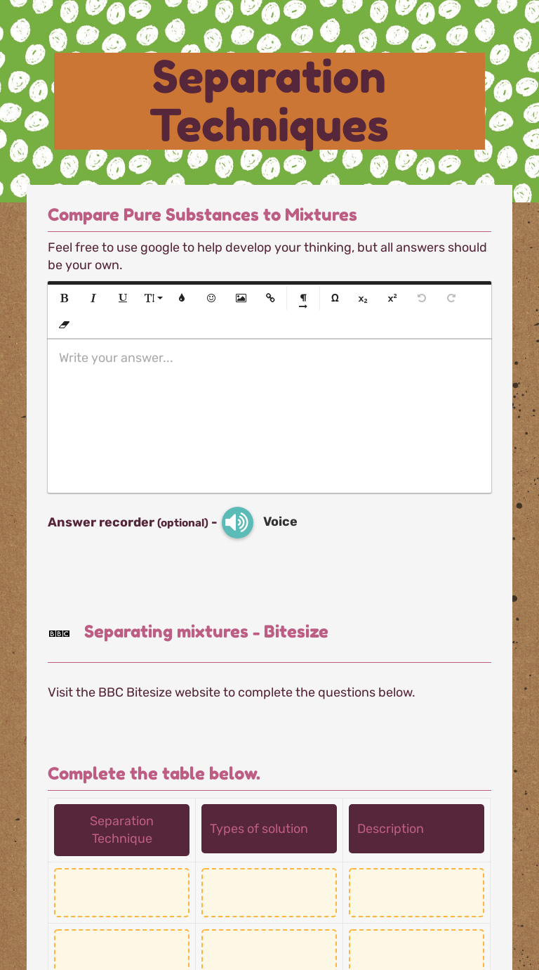 Separating Mixtures Worksheet Pdf - Worksheet Smart 04.01.2022 · Separating mixtures worksheet pdf. What separation process can the gallery use to test the paint on the canvas. Keep itsimple science kiss resources for the australian curriculum science worksheet 4 methods of separation 2. In this science worksheet your child devises and draws an experiment to separate the soluble and insoluble parts of rock salt. Fred is learning to … Separating Mixtures – Exam Questions - Weebly Mixtures – Exam Questions . 2012 - Higher Paper chromatography was used to find the composition of brown ink in a pen. The same liquid, paper and pen were used in each of the three experiments shown. They were started at different times, C first then B and finally A. Why is the ink dot above the level of the liquid in each beaker? What caused the dots of ink on the papers … Elements Compounds Mixtures worksheet ID: 1633108 Language: English School subject: Science Grade/level: 10 Age: 13-14 Main content: Chemistry Other contents: Add to my workbooks (51) Download file pdf Embed in my website or blog Add to Google Classroom