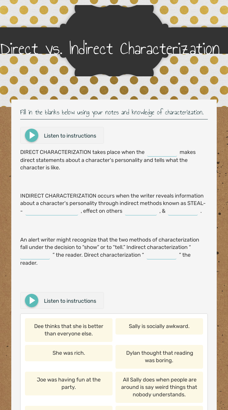 Direct vs. Indirect Characterization | Interactive ... Listen to instructions. DIRECT CHARACTERIZATION takes place when the makes direct statements about a character's personality and tells what the character is like. INDIRECT CHARACTERIZATION occurs when the writer reveals information about a character's personality through indirect methods known as STEAL-- , effect on others , & .