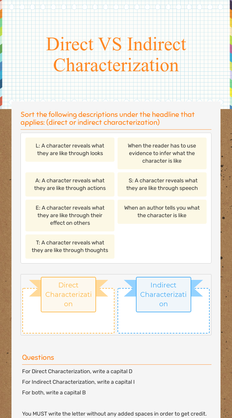 Direct And Indirect Characterization Worksheet Answers ... Direct And Indirect Characterization Worksheet Answers Work Bun November 19, 2021 Students read ten short examples of character interactions. Direct characterization is when a character takes on an active role in the plot by direct means while indirect characterization is using characters that have a behind the scenes role in the plot.