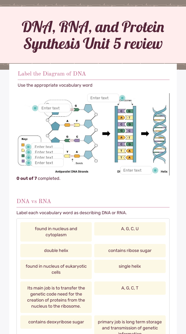 Dna And Rna Worksheets - Learny Kids Dna And Rna Displaying top 8 worksheets found for - Dna And Rna. Some of the worksheets for this concept are Dna and rna work, Dna base pairing work, The mysterious message an explanation of dna rna and, Work dna rna and protein synthesis, Chapter 7 molecular genetics from dna to proteins work, Dna structure work, Dna rna, Dna and rna structure.