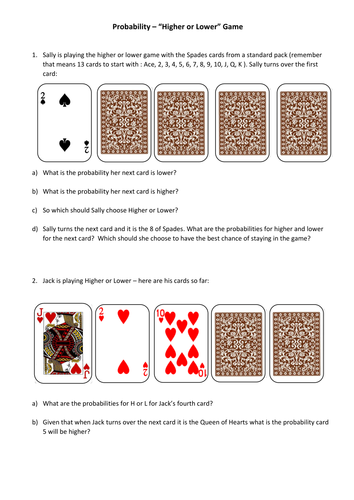 Probability With Deck Of Cards Teaching Resources | TpT 1. $2.00. PDF. This is a practical, hands-on investigation into how probability of events is affected depending on whether or not items are replaced. Students use a deck of cards to complete activities and answer questions on both theoretical and experimental probability. Students love the hands on component and t. Card Probability | Interactive Questions| Solved Examples Stay tuned to find out answers like probability of drawing a king! Lesson Plan. 1. What Do You Mean by a Deck of Cards? 2. Probability With a Deck of Cards Worksheet - Math-Aids.com You may enter a message or special instruction that will appear on the bottom left corner of the Probability Worksheet. Probability Worksheet Answer Page.