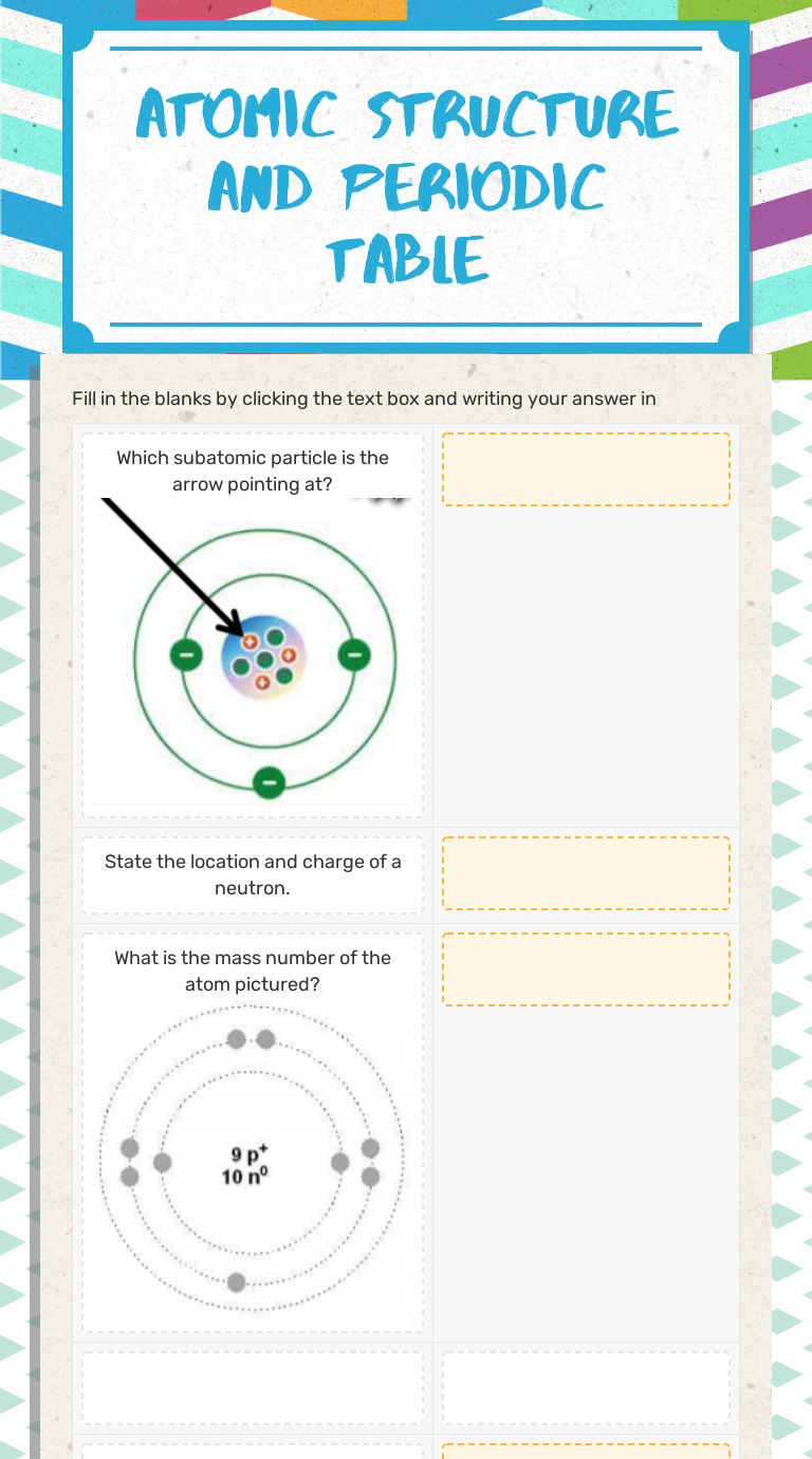 Atomic Structure Worksheets An awesome collection of free atomic structure worksheets for teachers. An atom is the smallest constituent These worksheets have students explore the nature of atoms and their structure. We look at the We will also look at how this affects an atoms location on the Periodic Table of Elements. PDF Basic Atomic Structure Worksheet 1. The 3 particles of the a The atomic number gives the "identity" of an element as well as its location on the periodic table. No two different elements will have the. atomic number. of an element is the average mass of an element's naturally occurring atom, or of each isotope. Atomic Structure Worksheet Complete The Table Answers Worksheets atomic structure worksheet atomic structure and the periodic table worksheet answers ebook chemistry worksheets for atomic Safarmediapps complete this table for neutral isotopes 4. Protons or atomic number. Some of the worksheets displayed are atomic structure... Atomic Structure worksheets and online exercises Live worksheets > English > Chemistry > Atomic Structure. Periodic Table. Stoichiometry. Atomic Structure. Atomic Structure Grade/level: Grade 3 by Zunawan1s.