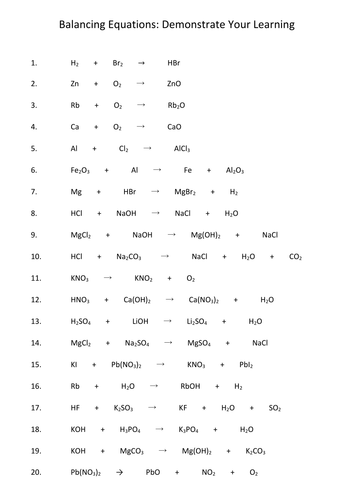 Balancing Chemical Reactions Worksheets - Teachers Pay Teachers This is a short worksheet for students to practice balancing chemical reactions. Four chemical reactions are listed with a brief description; two combustion reactions, one organic reaction and one inorganic reaction. Page 1 is the worksheet and page 2 is the answer sheet; students can be given only