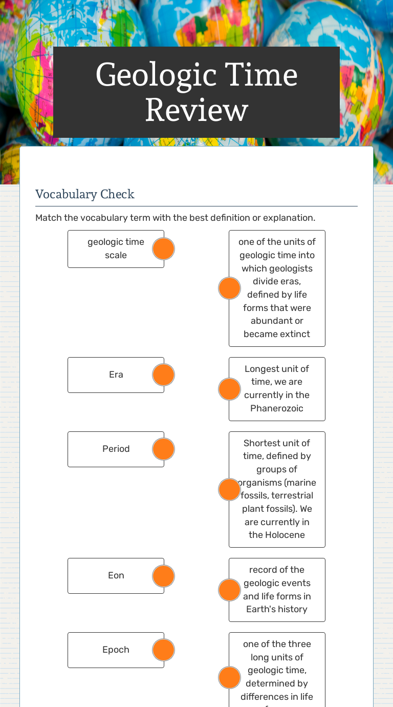 Geologic Time Scale - Printable - PurposeGames.com About this Worksheet. This is a free printable worksheet in PDF format and holds a printable version of the quiz Geologic Time Scale.By printing out this quiz and taking it with pen and paper creates for a good variation to only playing it online. Geologic Time Scale Worksheet - Thomas nazario Geologic Time Scale Worksheet. Add to my workbooks (8) download file pdf embed in my website or blog add to google classroom It is a worldwide scale developed by correlation of fossils from all around the world. Geologic Time Scale Worksheets from Explain the relationships among eons, eras, epochs and periods of the geologic