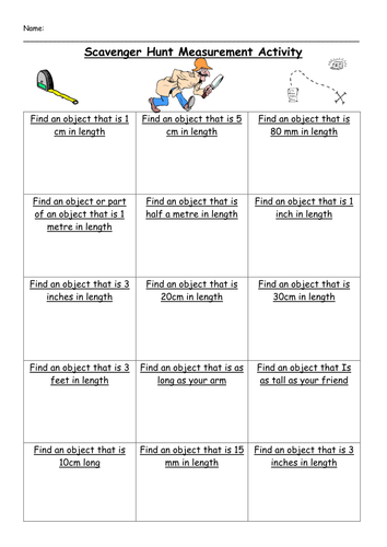 Measurement Scavenger Hunt - Curriculum Resources Measurement Scavenger Hunt Student Directions: 1. Get a paper and put your name at the top. 2. Gather your tools. You will need a ruler and a yardstick. 3. Measure the things listed on your worksheet. You will need to decide which tool is better to use. 4. Measure to the nearest inch, half-inch, quarter-inch, or yard. 5. Measurement Scavenger Hunt Worksheets & Teaching Resources | TpT Measuring Scavenger Hunt by Dragonflies and Dandelions 38 $2.00 PDF A fun, engaging activity to use as an informal assessment. It is designed to be used with partners. The units included are centimeters, inches, feet, and yards.
