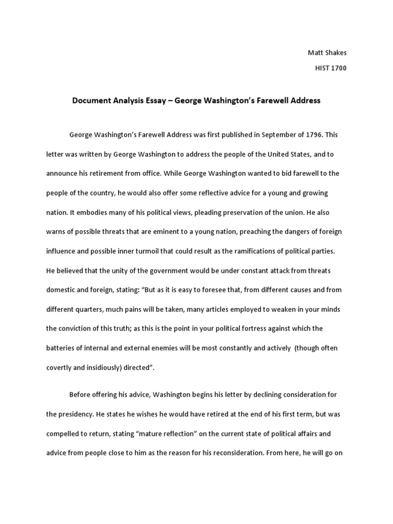 Washington's Farewell Address Document Analysis #2.docx ... View Washington's Farewell Address Document Analysis #2.docx from HIST 1010 at Clemson University. Instructions Over the course of the semester you will complete five document analysis worksheets.