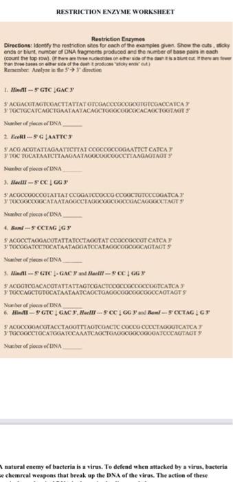 Restriction_enzymes_worksheet.pdf - GUIDED PRACTICE ... View Restriction_enzymes_worksheet.pdf from BIO 123 at Shanghai American School - Puxi. GUIDED PRACTICE RESTRICTION ENZYME WORKSHEET #1 Name: A natural enemy of bacteria is a virus. To defend when