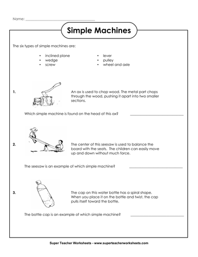 Simple Machines Worksheets - Math Worksheets 4 Kids Explore these simple machines worksheets for grade 3, grade 4 and grade 5 to learn about the six types of simple machines - lever, pulley, wheel and axle, screw, wedge and inclined plane and the three classes of levers with ample examples, charts and hands-on activities for an in-depth understanding of the use of simple machines in our day-to ...