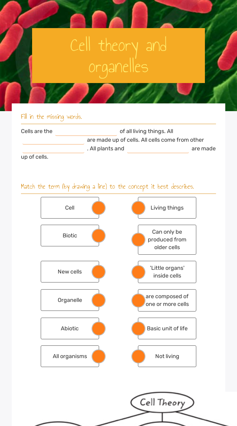 Cells the units of life worksheet answers. PDF Lesson Outline for Teaching - Readington Township Public ... The cell is the smallest unit of life. All new cells come from preexisting cells. B. Basic Cell Substances 1. Macromolecules form when many small molecules join. 2. The main ingredient of any cell is water. 3. The structure of a water molecule makes it ideal for dissolving many other substances. 4. CBSE Class 9 Biology Cell The Unit Of Life Worksheet ... Read and download free pdf of CBSE Class 9 Biology Cell The Unit Of Life Worksheet. Students and teachers of Class 9 Biology can get free printable Worksheets for Class 9 Biology in PDF format prepared as per the latest syllabus and examination pattern in your schools. Standard 9 students should practice questions and answers given here for Biology in Grade 9 which will help them to improve ... Grade 8 Nelson Science - Chapter 4; Cells: The Basic Unit ... Start studying Grade 8 Nelson Science - Chapter 4; Cells: The Basic Unit of Life. Learn vocabulary, terms, and more with flashcards, games, and other study tools. PPT Cells: The Basic Units of Life The cell is the basic unit of life in all living things. All cells come from existing cells. Two Types of Cells Organelles Organelles are structures that enable the cell to live, grow and reproduce.