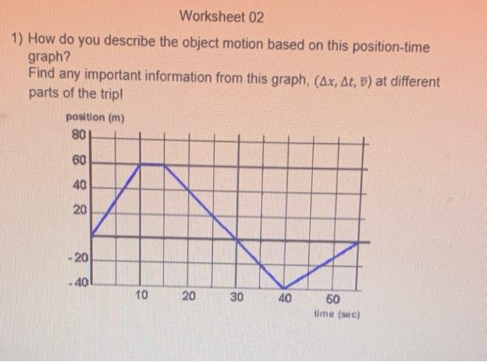 PDF Describing Motion with Position-Time Graphs Describing motion with graphs involves representing how a quantity such as the object's position can change with respect to the time. The key to using position-time graphs is knowing that the slope of a position-time graph reveals information about the object's velocity. By detectingthe slope, one can infer about an object's velocity. "As the Position Vs Time Graph Worksheet Answer Key - worksheet Position Vs Time Graph Worksheet Answer Key. Some of the worksheets for this concept are date pd constant velocity particle model work 1 skill and practice answer keys physics 20 d t v t graph work name uniformly accelerated motion model work 1 chapter 5chapter 5 chapter organizer motion distance and. For the following velocity vs. Using Position vs. Time Graphs to Describe Motion - Video ... Position vs. time graphs can be a great way to pack all the information describing the motion of an object into one figure. If we set up our graph with position on the y-axis and time on the x ...