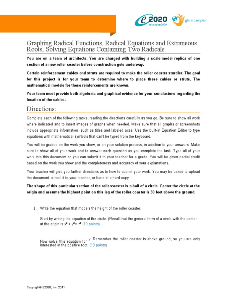 Algebra II B (Edgenuity)- Roller Coaster Design (PDF) .pdf ... Roller Coaster Design Graphing Radical Functions, Radical Equations and Extraneous Roots, Solving Equations Containing Two Radicals You are on a team of architects. You are charged with building a scale-model replica of one section of a new roller coaster before construction gets underway. Certain reinforcement cables and struts are required to make the roller coaster sturdier.