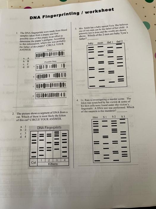 43 dna fingerprinting worksheet answer key - Worksheet Works Dna fingerprinting worksheet answer key. DNA Fingerprinting Worksheet Answer Key Worksheet June 03, 2018 04:53 DNA Fingerprinting Worksheets is an awesome teaching tool that helps you to learn this valuable lesson. Inquiry Based Investigation Dna Fingerprint Analysis Tpt from ecdn. 3-5 Oct 25, 2021 · Crime scene dna fingerprinting worksheet. mogador-international.de Dna Fingerprinting Worksheet Answer Key - Your youngster is currently prepared to go on to more advanced math concepts, such as multiplication and division. 1. 11. Dna fingerprinting is a method used to identify an individual from a sample of dna by looking at unique patterns in their dna. Acces PDF Dna Fingerprint Analysis Gizmo Answer Key ...