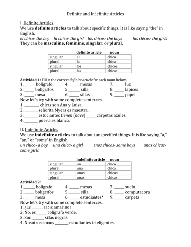 Spanish Definite And Indefinite Articles Teaching ... Spanish 1 Worksheets - Definite and Indefinite Articles in Spanish by Woodward Education 186 $4.00 PDF Definite and Indefinite Articles in Spanish - El, La, Los, Las - Un, Una, Unos, Unas - Includes 10 pages of exercises, a wall chart/poster (A4), Vocabulary Lists and Teacher Answers. These activities are ideal for a Spanish 1 level class.