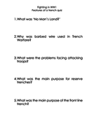 World War One Worksheets - History The Trenches A Worksheet explaining the facts and details of life in the trenches. Trench Diagram (A) An enlarged diagram of a trench to go with the worksheet above. Trench Diagram (B) An enlarged cross section of a trench to go with the worksheet above. Trench Definitions A matching exercise to test understanding of the components of a trench.