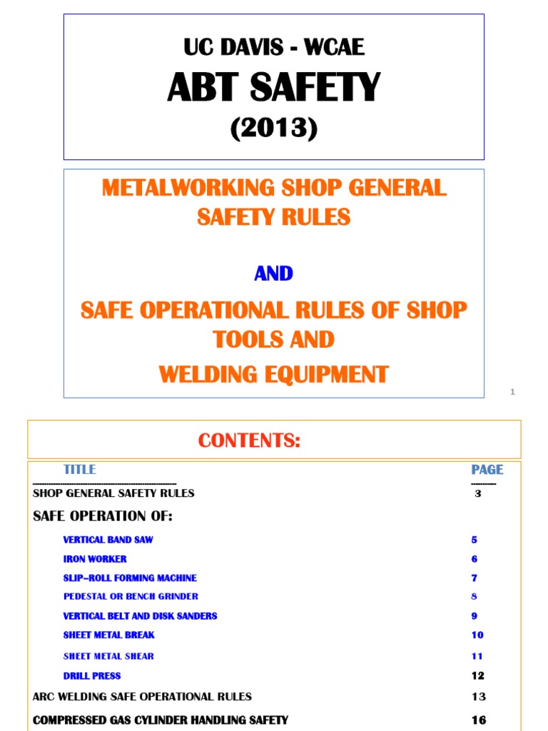 Safety Practices In Welding Safety Practices In Welding Worksheet Complete the following study guide. Use the Safety Practices In Welding Packet Introduction Arc welding is a safe occupation when ___________________________ are taken to protect the welder from potential hazards. When these measures are overlooked or ignored, however, welders can encounter such dangers as PDF Quiz and Answer Key Welding Safety 13-026 1. Two of the more common types of welding are gas and shielded metal arc. True or False 2. The most common fuel used in OxyFuel Welding is acetylene. True or False 3. Shielded Metal Arc Welding joins two metals together by producing a laser arc between the base metals to be joined and a flux coated consumable electrode rod. True or False 4. PDF General Shop Safety - Virginia Tech General Shop Safety I. Competencies Given the instruction in this unit each student will be able to pass a written test on general shop safety with a minimum of 100 percent accuracy. II. Instruction Material and Procedures 1. Wear clothing which is conducive to work in the mechanics laboratory, i.e., coveralls, shop