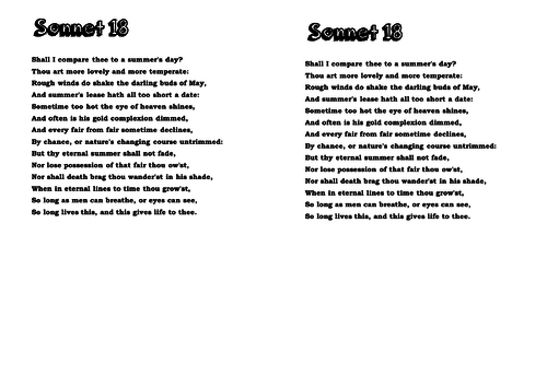 Sonnet 18 poem and questions worksheet | Teaching Resources docx, 15.01 KB. Shakespeare's Sonnet 18 one page worksheet with the poem, translation of unusual words and a selection of questions for students to complete. Independent working after poetry study recommended.