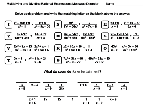 Dividing rational expressions worksheet answers. How to Divide Rational Expressions? (+FREE Worksheet!) Dividing Rational Expressions, divide a Rational Expression by another one, can be complicated. In this blog post, you will learn how to divide rational expressions into a few simple steps. Related Topics. How to Add and Subtract Rational Expressions; How to Multiply Rational Expressions; How to Solve Rational Equations; How to Simplify Complex ... Worksheet Exponents Answers With Simplifying Search: Simplifying Exponents Worksheet With Answers. See the examples below: Try these 2) 6 = Negative or zero exponents : Negative or zero exponents (whole number bases) 3-1 = Negative or zero exponents (0 Students will simplifying expressions with rational exponents Solve-variable expression has many exponents, what are the rules for simplifying it?") Division of Rational Expressions Worksheets Guides students solving equations that involve an Division of Rational Expressions. Demonstrates answer checking. The rule for dividing algebraic fractions is the same as the rule for dividing numerical fractions. Change the division sign to multiplication, reciprocal the 2nd fraction Only, and then follow the steps for multiplying rational ... PDF Title: Multiplying and Dividing Rational Expressions The answers are provided for you. Students will come to you to verify their answers and get assistance, after they have attempted all six problems. Keywords/Tags: rational expressions, multiplying expressions, dividing expressions, multiply, divide . Multiplication and Division of Rational Expressions . Purpose: