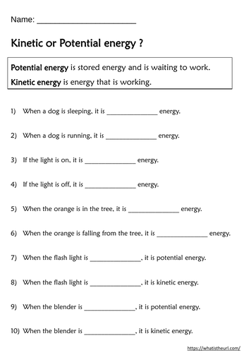 Potential and Kinetic Energy | Worksheet | Education.com This worksheet will teach your little scientists the difference between kinetic (movement) and potential (stored) energy. They will look at illustrations such as a sleeping dog and a windmill and label them as kinetic or potential energy. Download Free Worksheet View answers Add to collection Assign digitally Grade Third Grade Subject Science