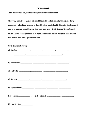 Part of speech worksheet middle school. PDF Parts of Speech - Open School anymore. I became a member of a school. My school was small, with the strong identity. They were always holding school pride events and showing on the talent of the school community. Students there were always nice to my best friend and I because we were popular. We shared so many good times and bad times, laughters and sorrow. When Parts of Speech Exercises [Worksheet] with Answers Every word used in a sentence fulfills a function and occupies a position. These words are divided into clauses called parts of speech, according to the function they fulfill. These parts of speech exercises will let you understand them better. We have written down sentences for each clause separately. The answers are given at the end of each ... Middle School Parts Of Speech - Printable Worksheets Middle School Parts Of Speech Showing top 8 worksheets in the category - Middle School Parts Of Speech. Some of the worksheets displayed are Parts of speech, Parts of speech, Home, Parts of speech, The 8 parts of speech diagnostic assessment, Grammar usage, Woodson high school 9th grade summer grammar packet 2017, Parts of speech work. Parts of Speech Activities for Middle School | The Classroom Parsing, or identifying the parts of speech in a sentence, works effectively as a class activity, independent assignment or homework. Write a sentence on the board and then identify the different parts of speech together by writing the term above the word or using sticky notes. Assign a paragraph from a novel to parse independently. Writer Bio